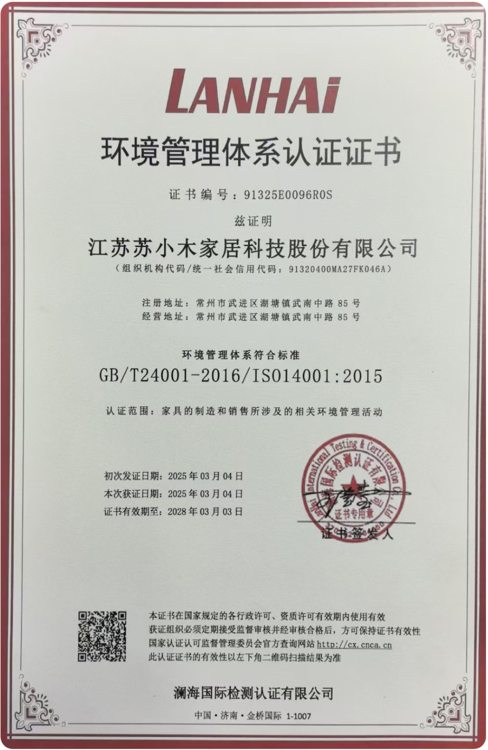 环境管理体系认证证书